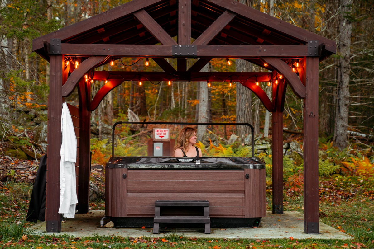 Our large hot tub is steps away from the cabins and open 24 x 7. It's shared between our three cabins.